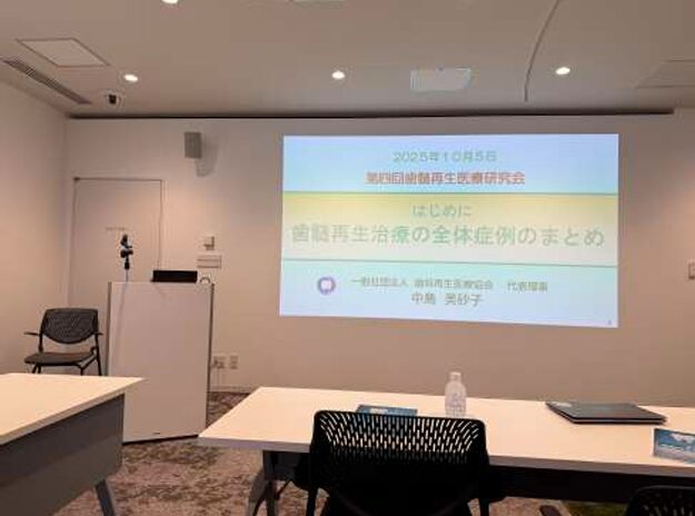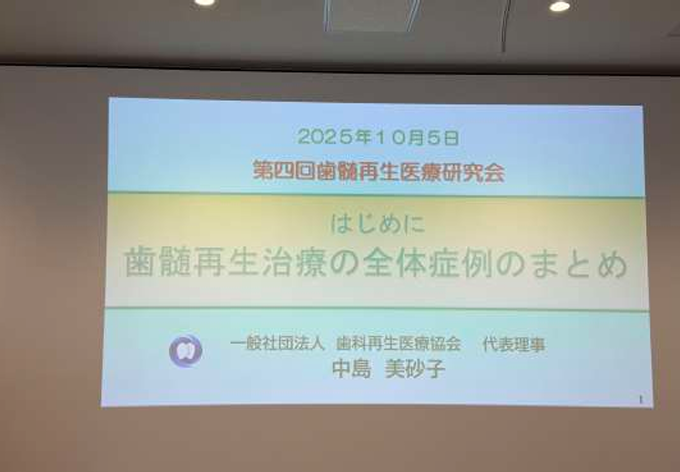中島先生より、「歯髄再生治療の全体症例のまとめ」と題しまして、歯の粉砕物を用いた歯髄再生治療(象牙質再生治療)に関する最新報告を聞くことができました。