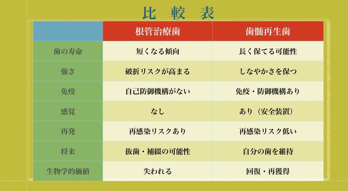 歯髄を守る・歯髄を再生する治療は、歯の寿命・強さ・将来の自由度のすべてで大きなメリットがあります。