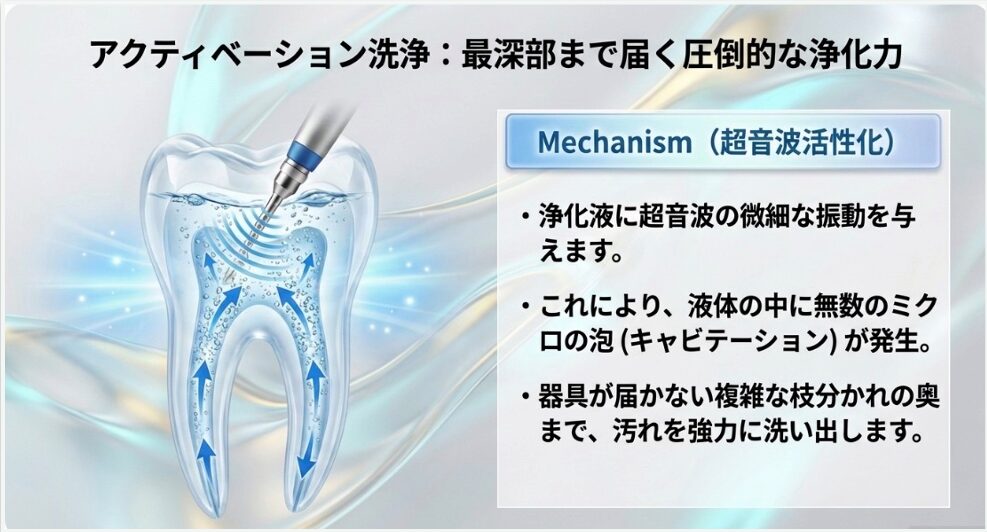 当院では、浄化液をただ注ぐだけではなく、超音波の微細な振動を与えます(超音波活性化:Ultrasonic Activation)
