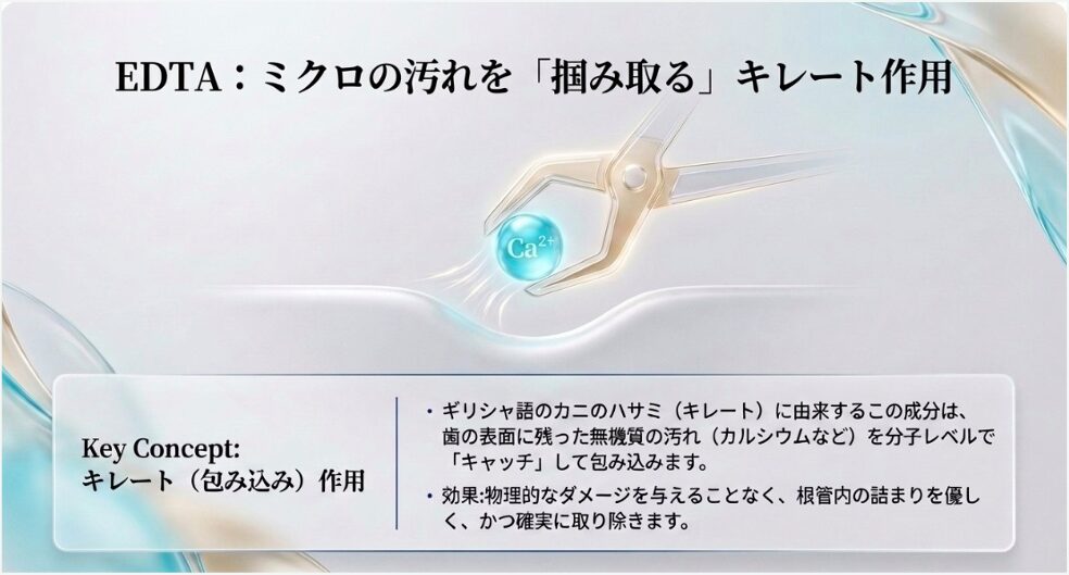 歯の表面に残った無機質の汚れ(カルシウムなど)を分子レベルで「キャッチ」して包み込みます。物理的なダメージを与えることなく、根管内の詰まりを優しく、かつ確実に取り除きます。