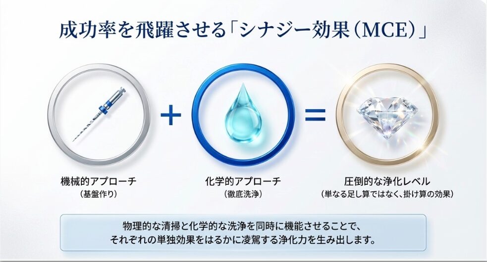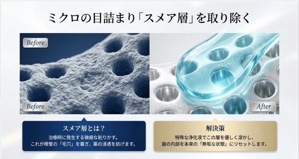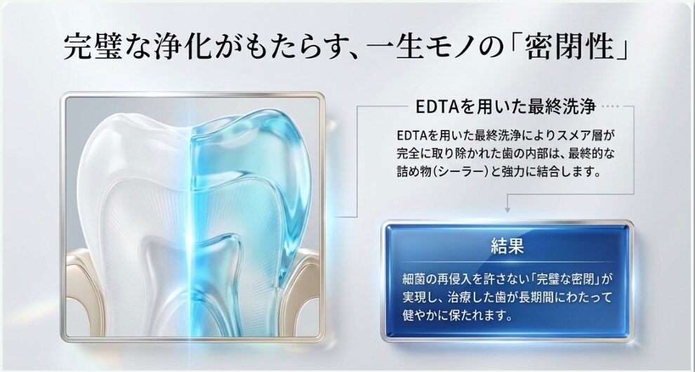 スメア層を取り除くことで、歯の内部が本来の「無垢な状態」にリセットされ、最終的な根管充填(シーラー)とより強く結合できるようになります。