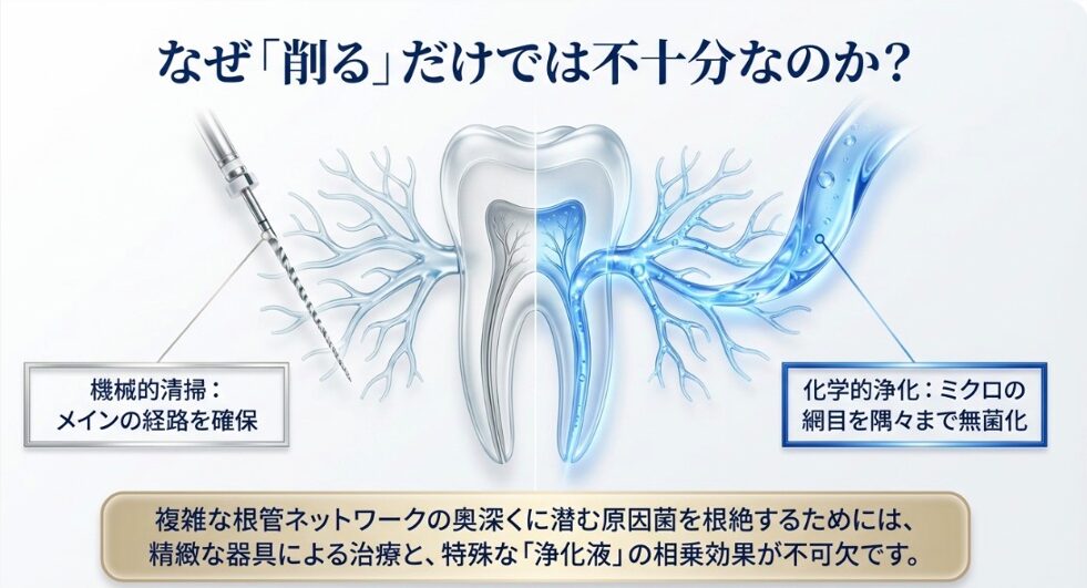 器具(ファイル)で根管を削って清掃することを「機械的清掃」といいます。これはメインの通路を確保するために非常に重要です。しかし、どんなに精巧な器具を使っても、このミクロの網目の奥深くに潜む細菌まで物理的に取り除くことは不可能です。