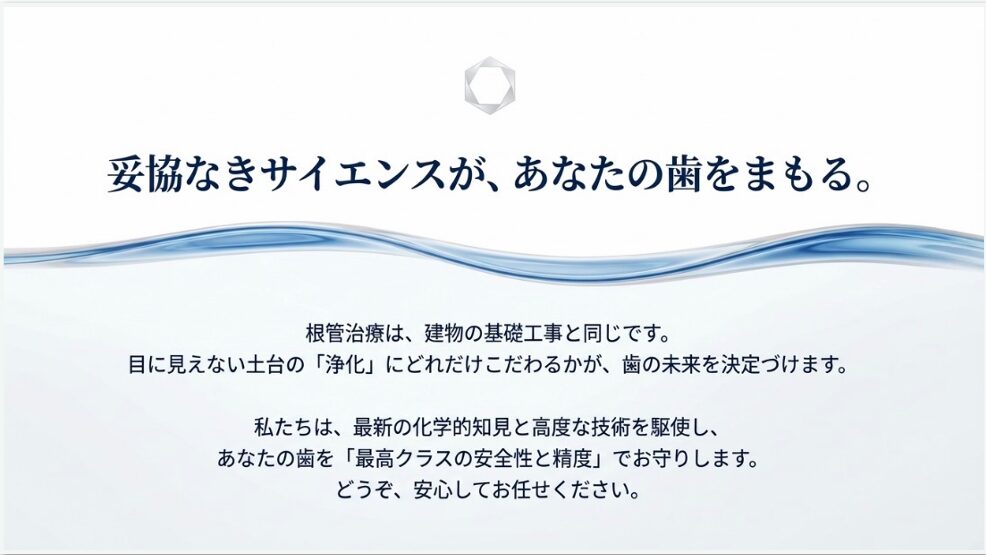 根管治療は、建物の基礎工事と同じです。目に見えない土台の「浄化」にどれだけこだわるかが、歯の未来を決定づけます。