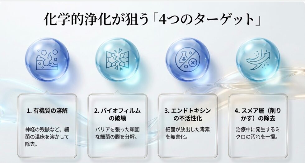 浄化液が根管内で攻撃するターゲットは、主に以下の4つです。