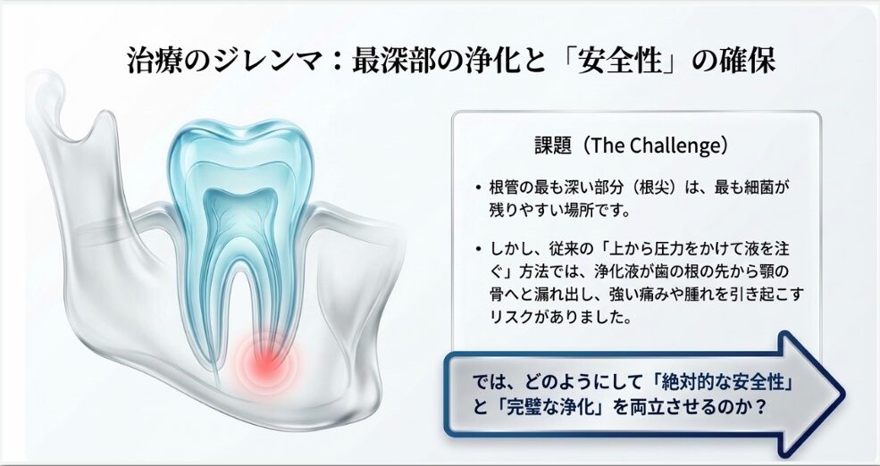 しかし、従来の「上から圧力をかけて液を注ぐ」方法では、浄化液が歯の根の先から顎の骨へ漏れ出し、強い痛みや腫れを引き起こすリスクがありました。