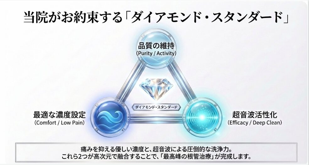ただし、濃度が高いほど殺菌力は上がりますが、術後の「痛み」のリスクも高まります。当院では最新の論文データに基づき、低濃度(1.3%)でも効果を最大化する特殊な撹拌技術を採用。