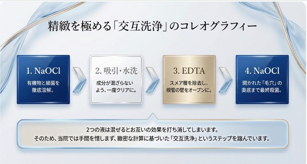 そのため当院では、手間を惜しまず、以下の「交互洗浄」と呼ばれるステップを踏んでいます。